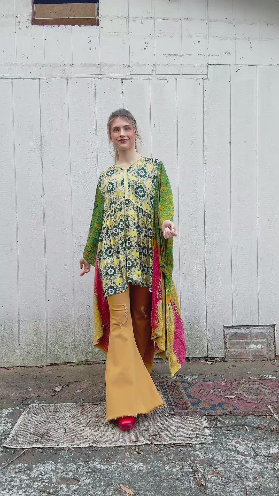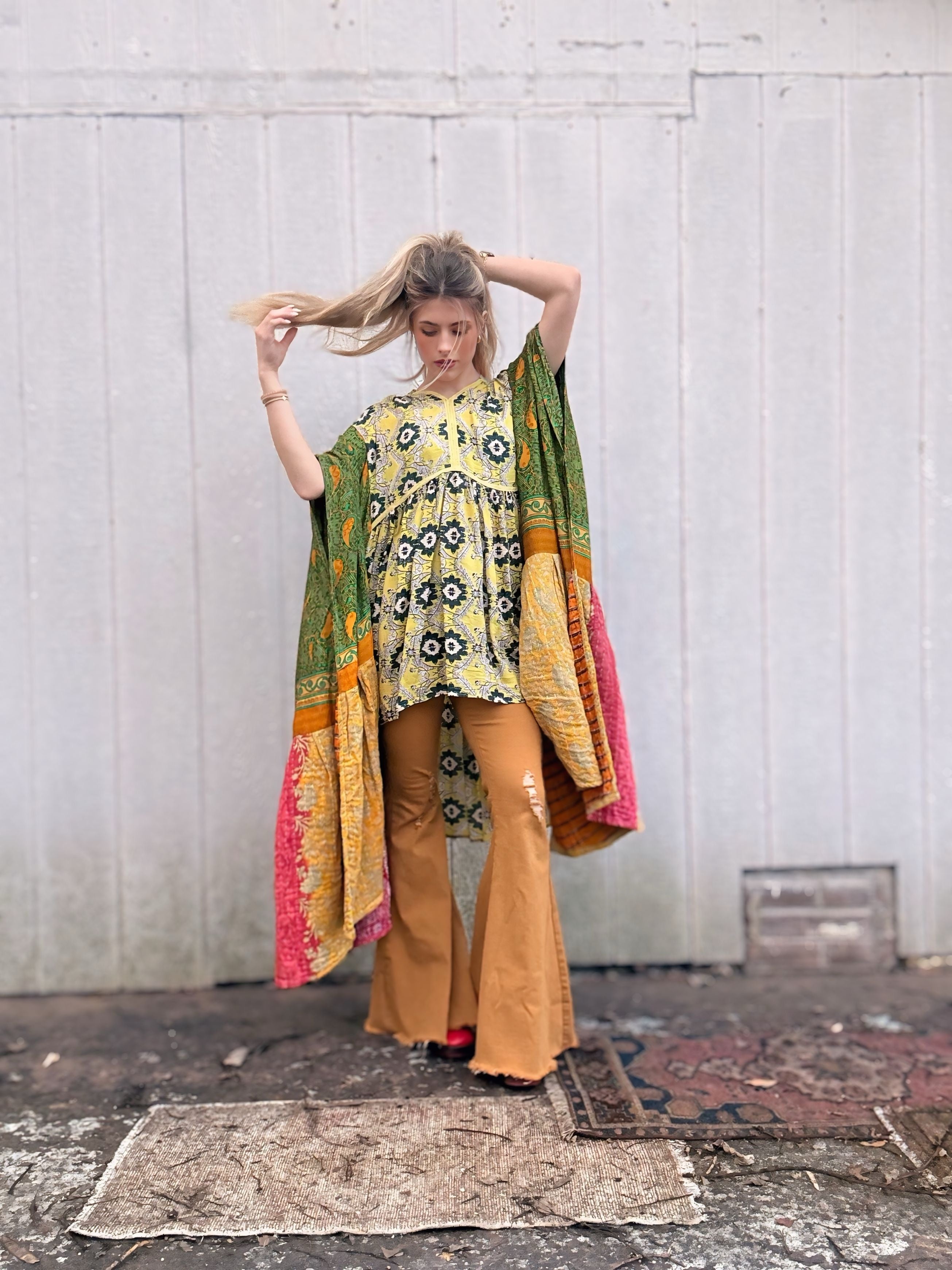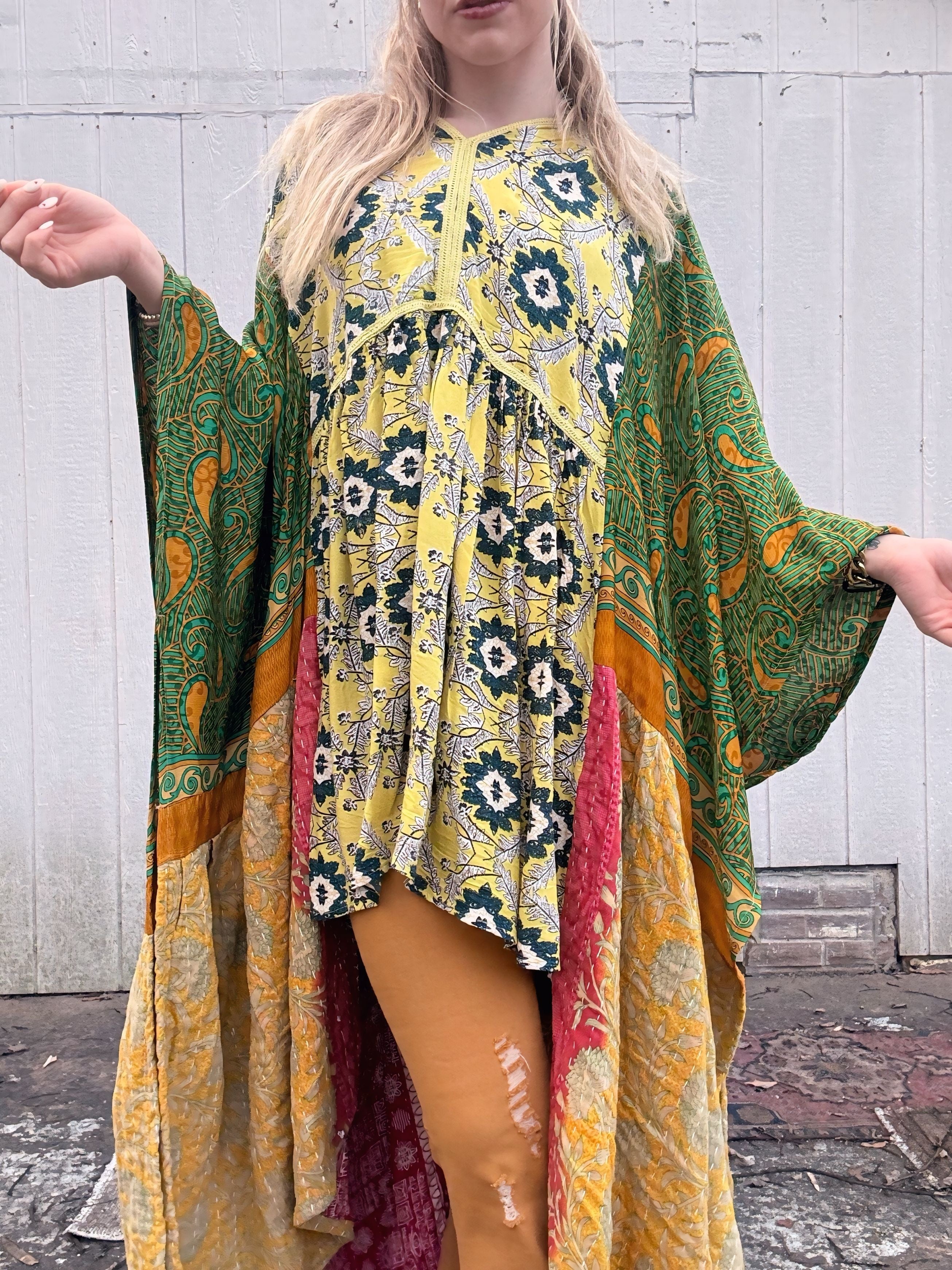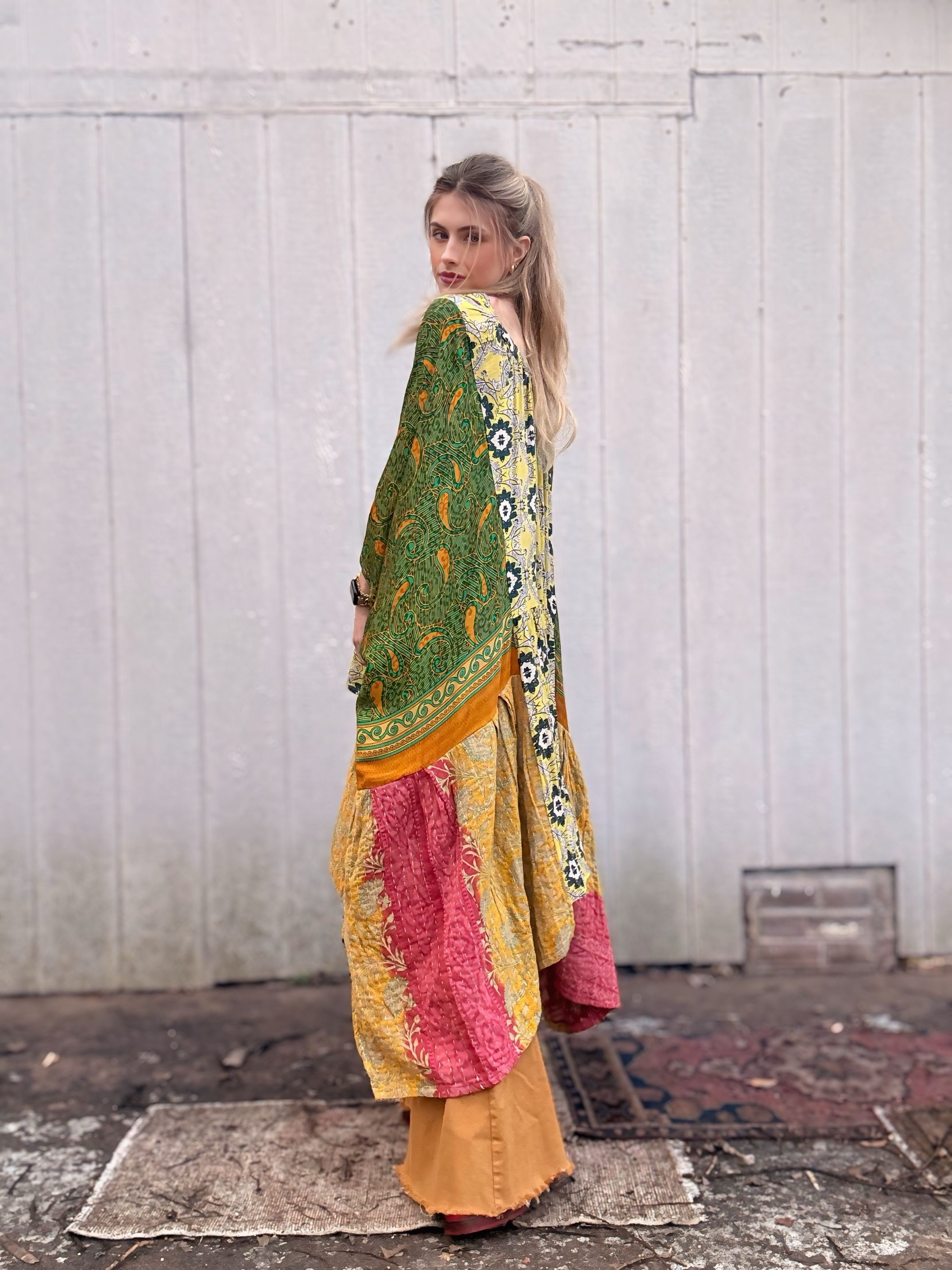 Long Colorful Kantha Poncho Tunic - Free Size