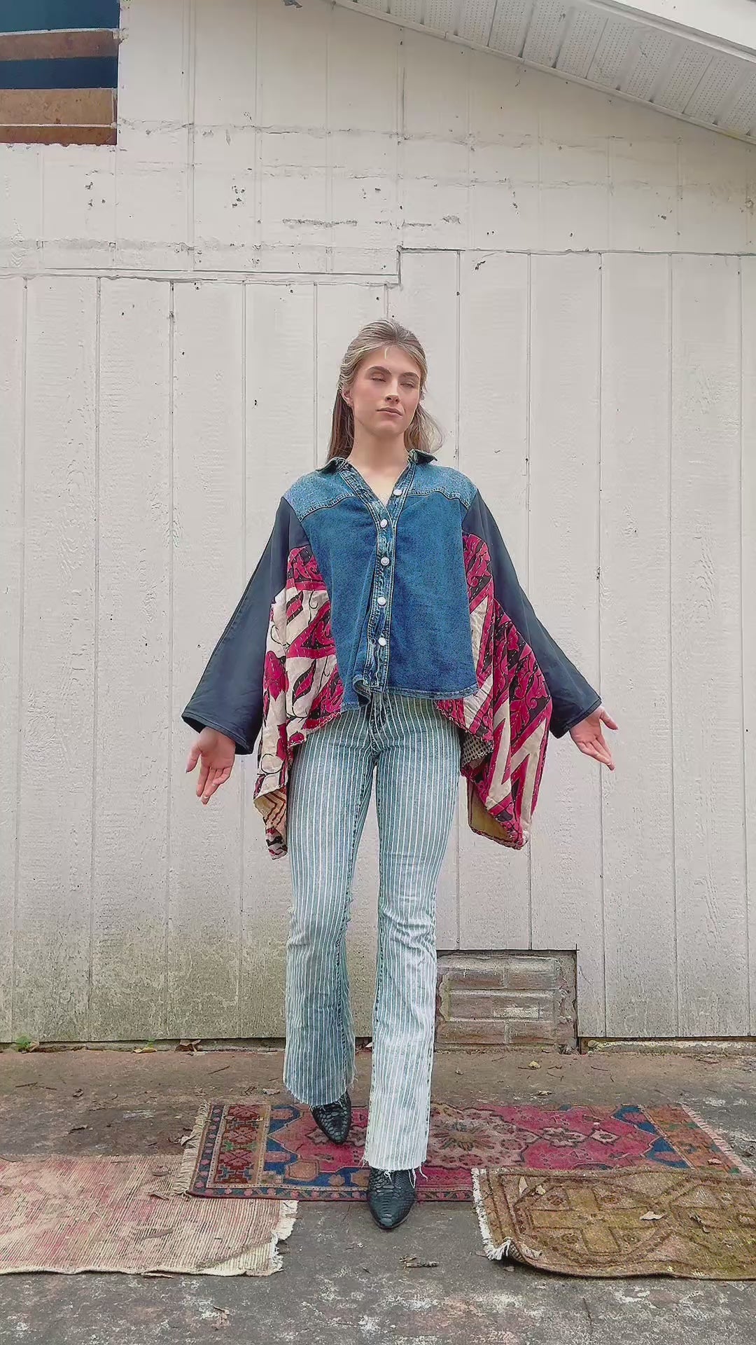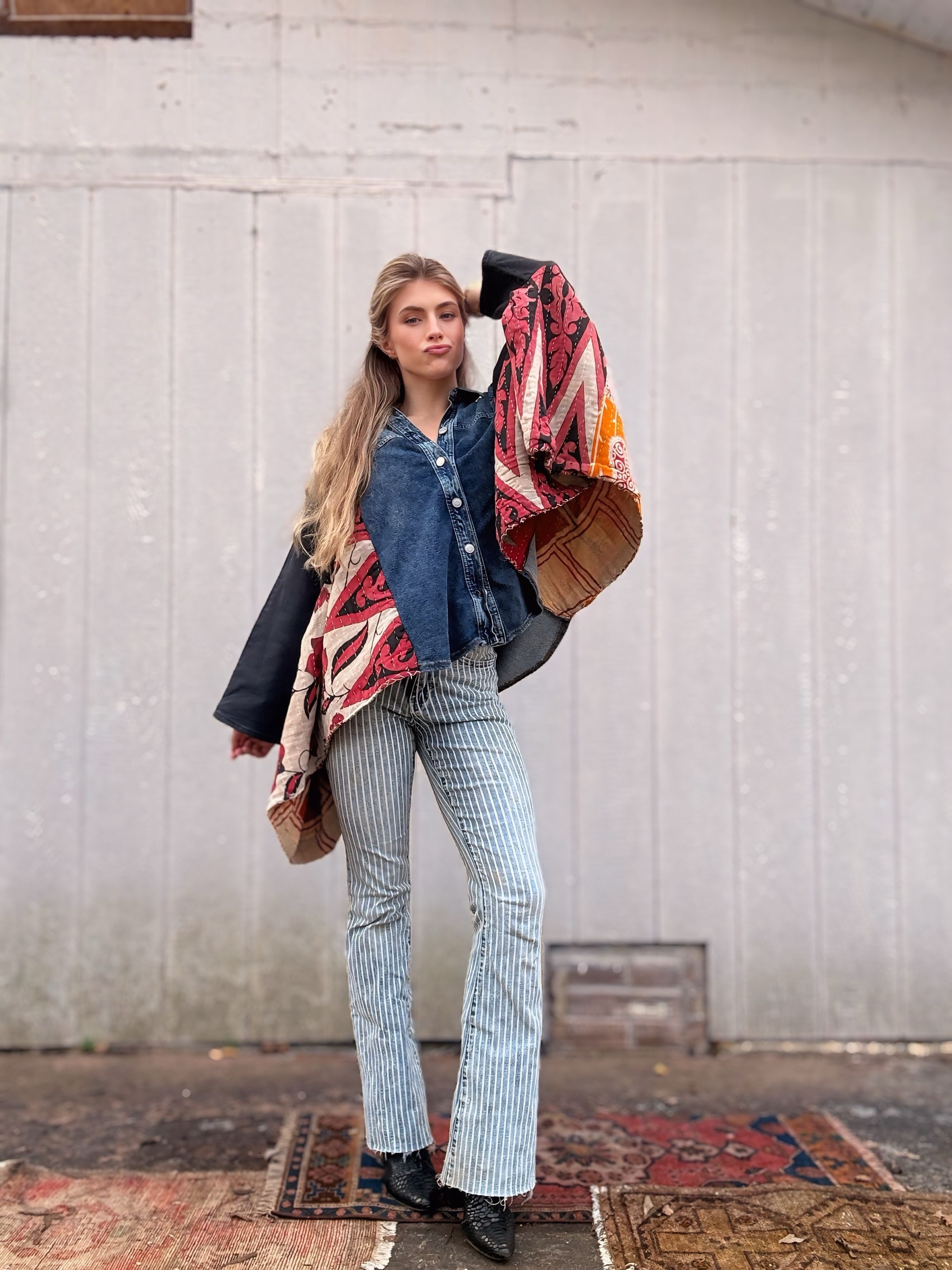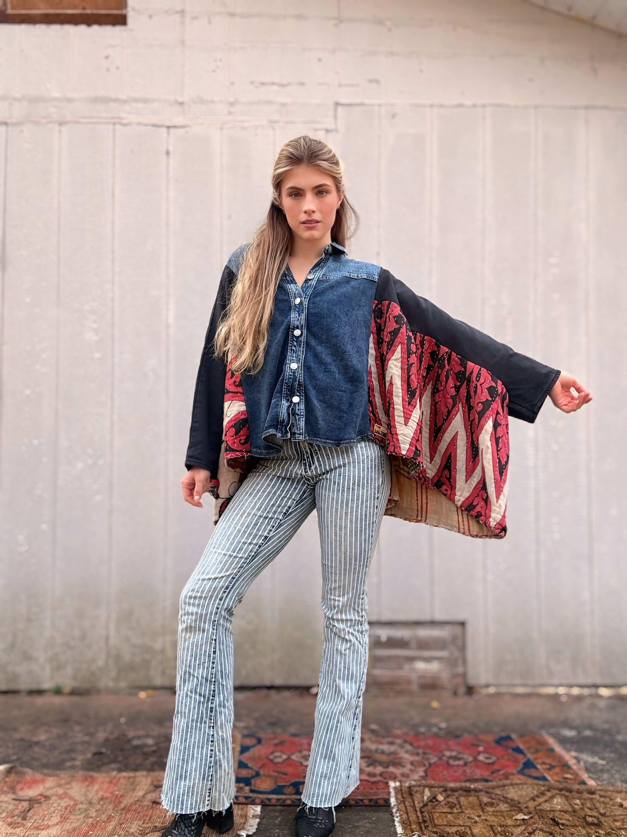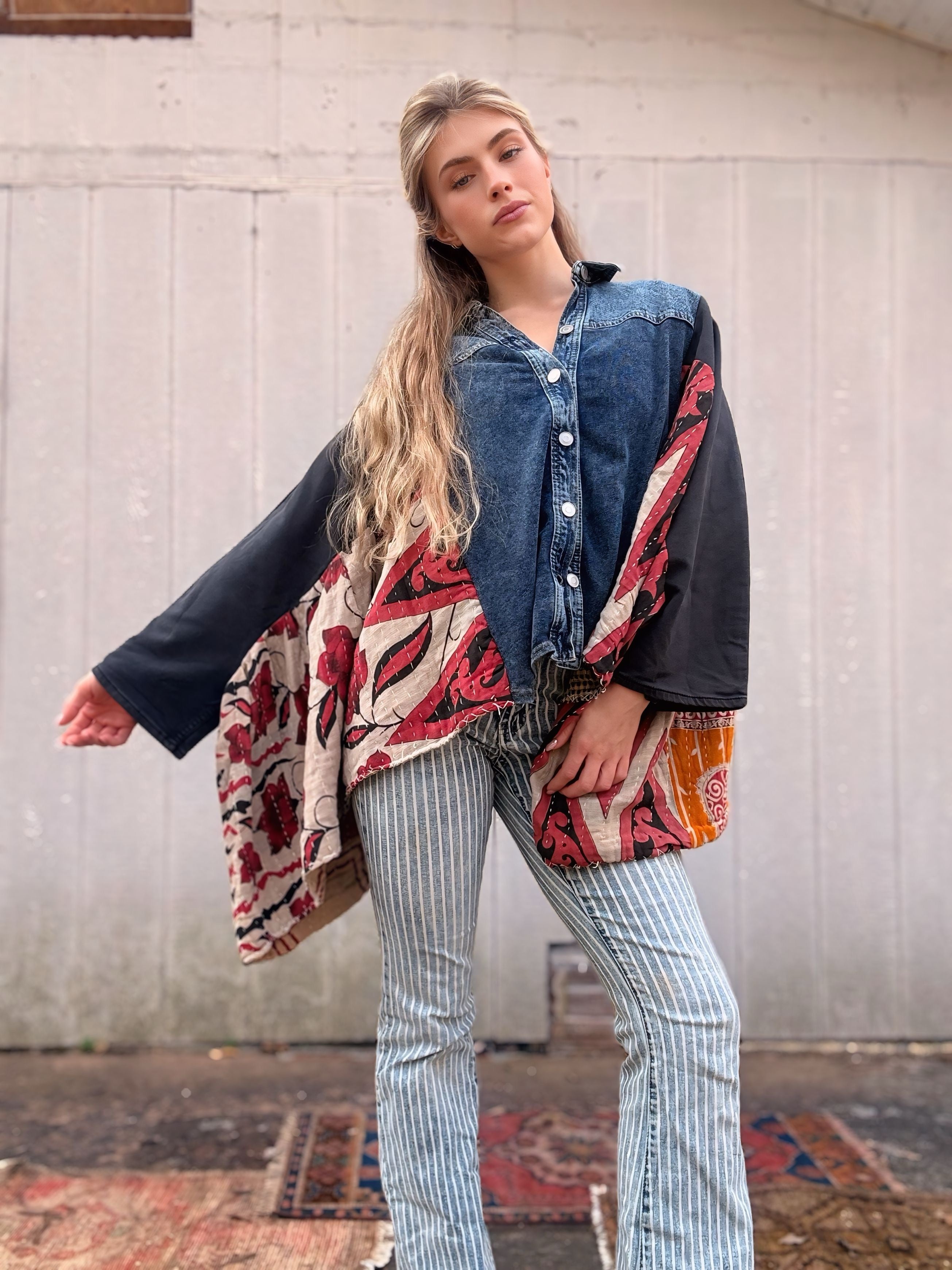 Stretchy Denim + Kantha Wing Top- Free Size