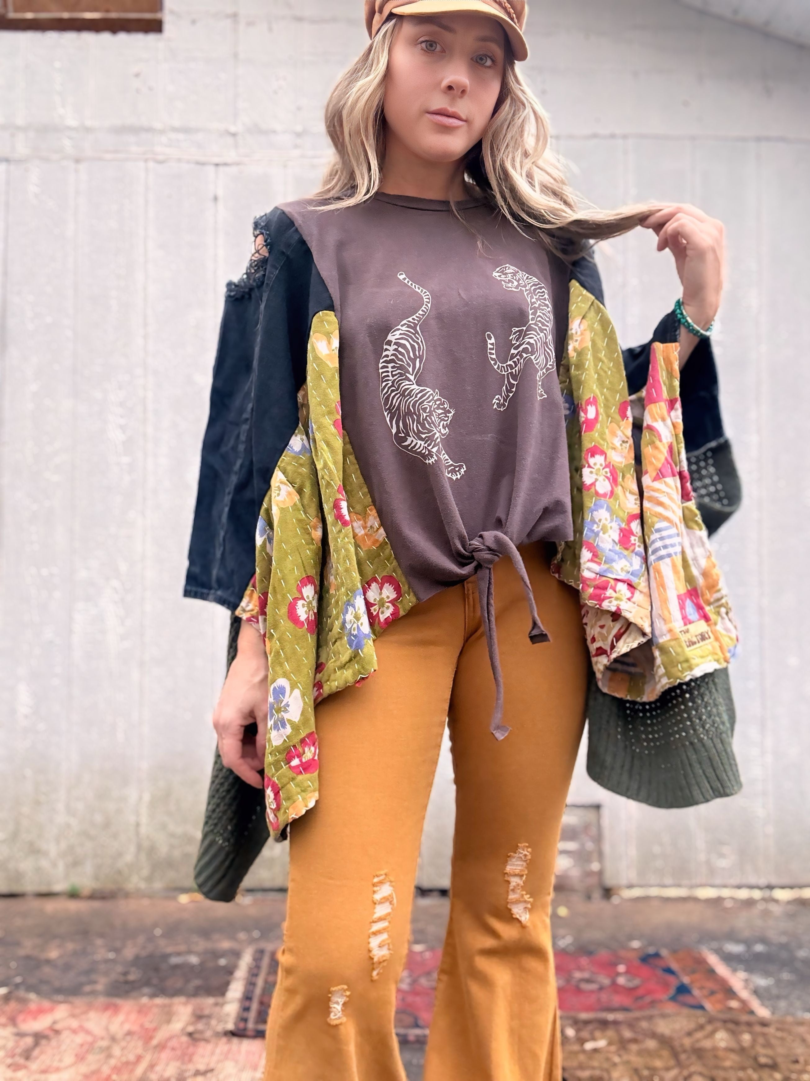 Tiger Kantha Denim Sleeve Top - Free Size